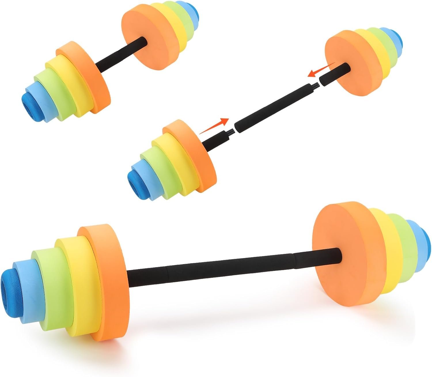 - Free Assembly: Our aquatic exercise dumbbells consist of 8 foam plates and 3 poles, you can choose the number of foam plates you want to assemble on each side as needed. In addition, the pole has three sections, which can be freely adjusted to the length