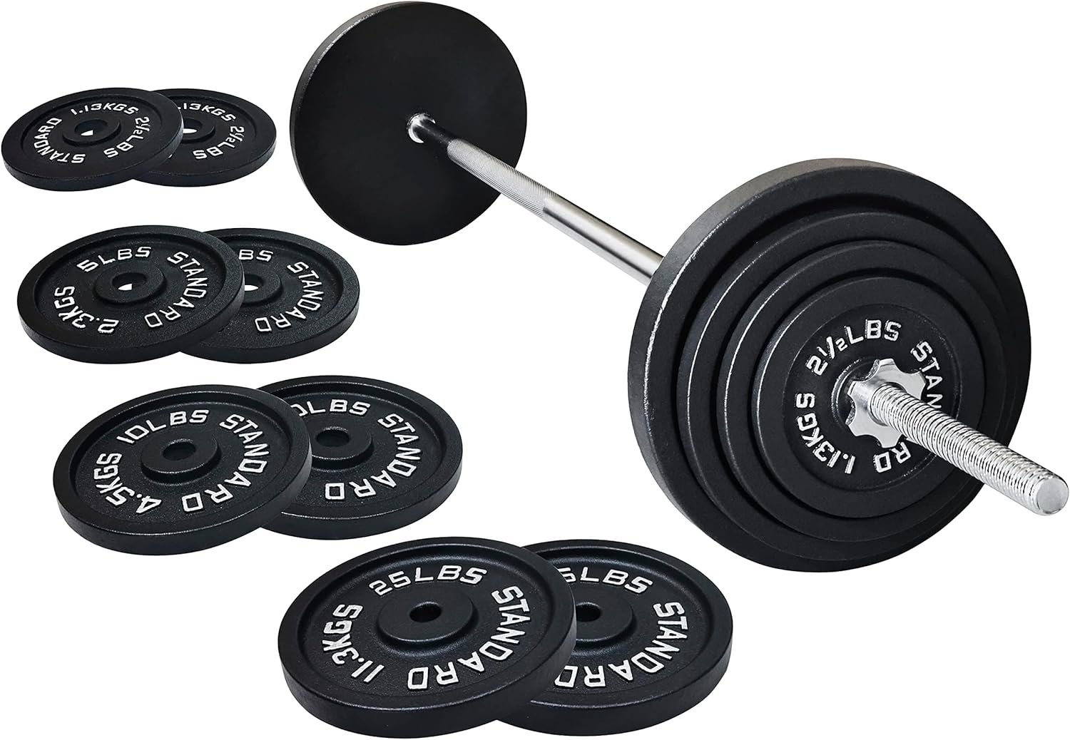 - 95 pounds set: 1x 5 feet Standard Barbell Bar (10 lbs) & Star Locks, 2x 2.5lbs, 2x 5lbs, 2x 10lbs, 2x 25lbs Cast Iron Plates.